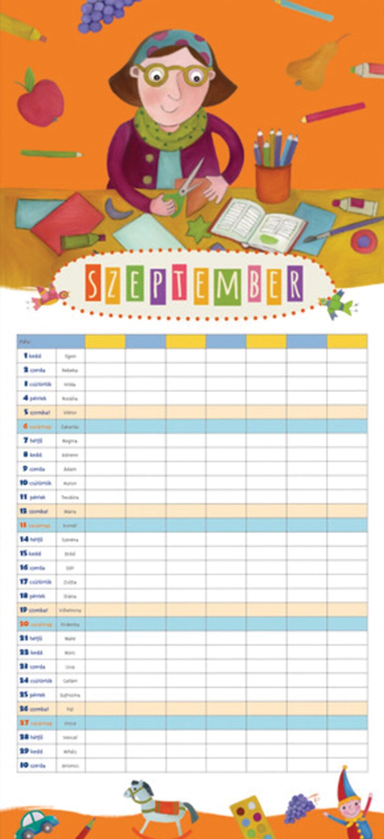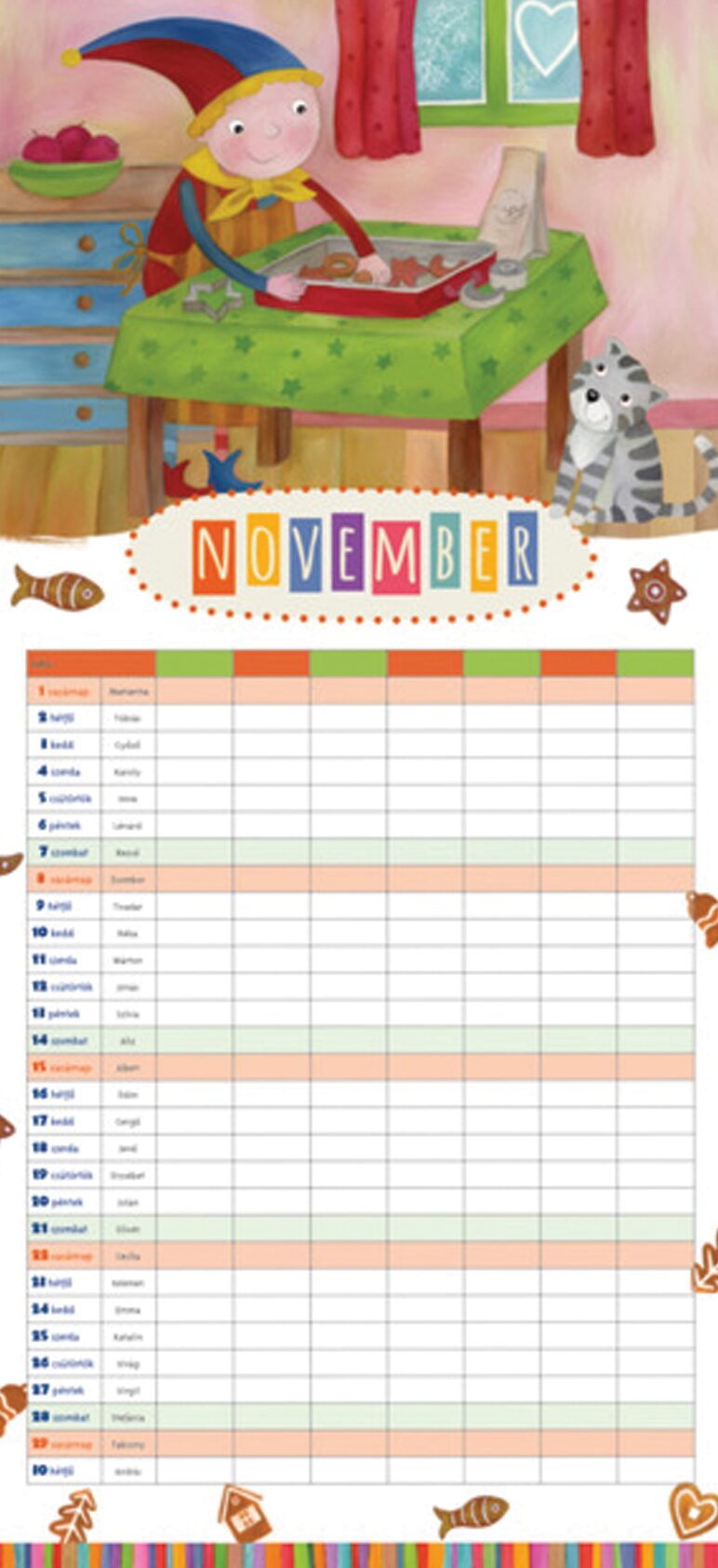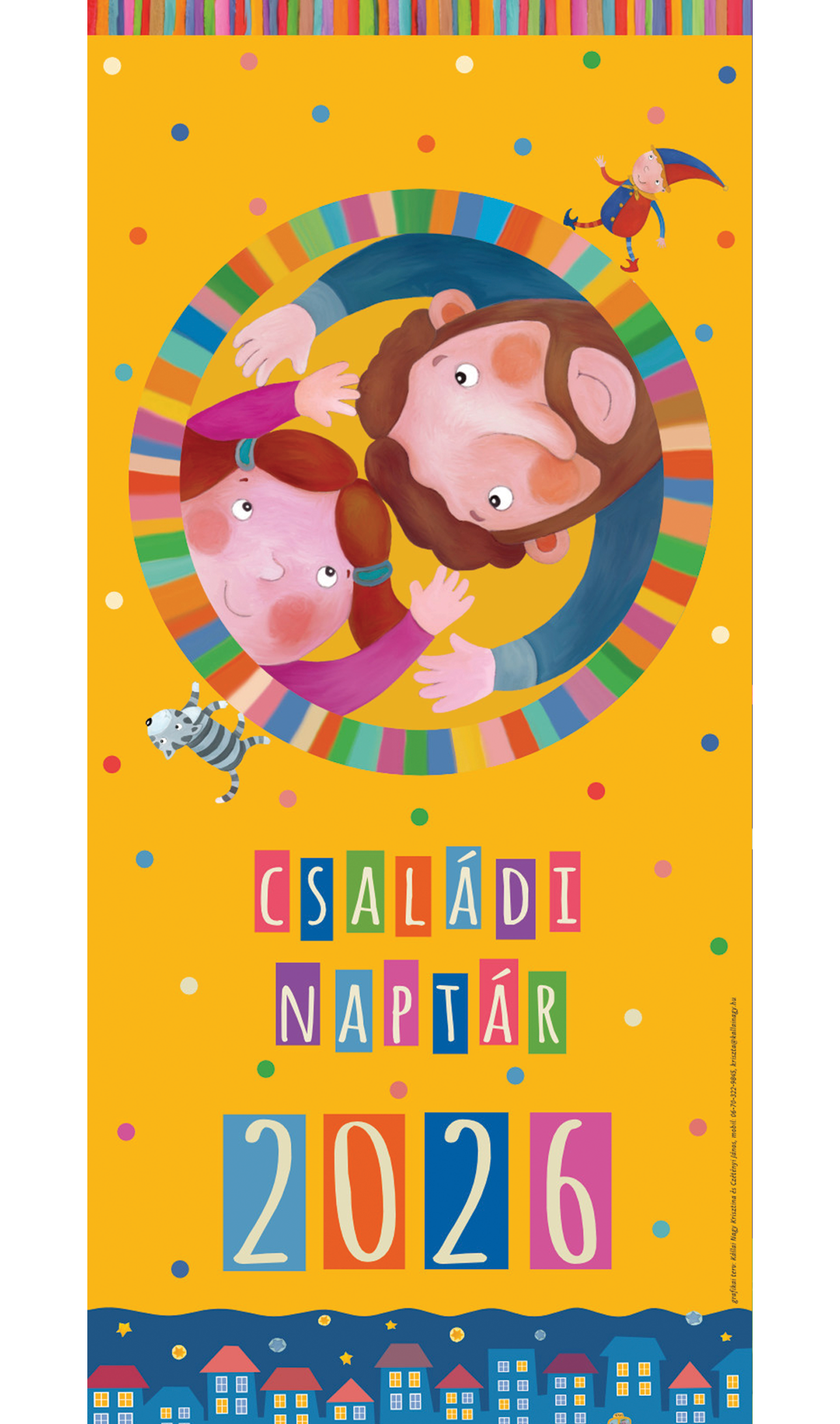 Kállai Nagy Krisztina grafikusművész, aki többekközött a nagysikerű Magyar szentek élete és Templomba megyünk című könyvünket is illusztrálta, évek óta készít családi naptárat, amelyet a tőle megszokott vidám, szivet melengető rajzaival szinesít.