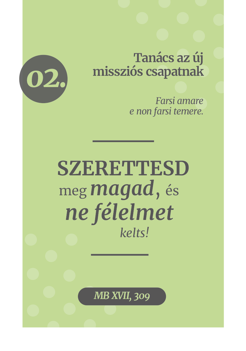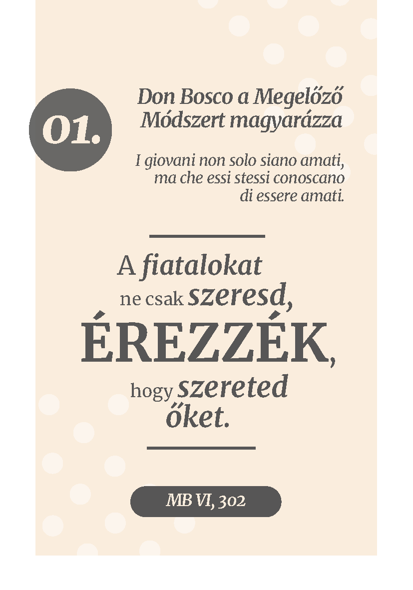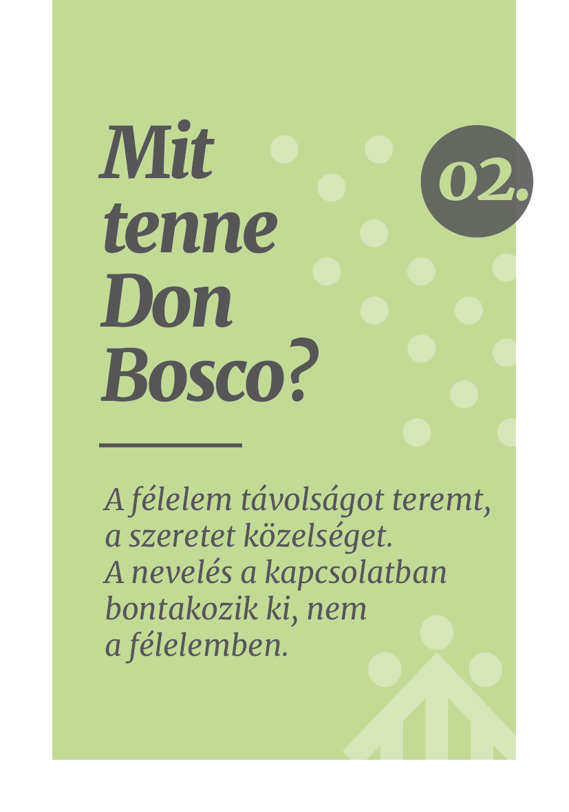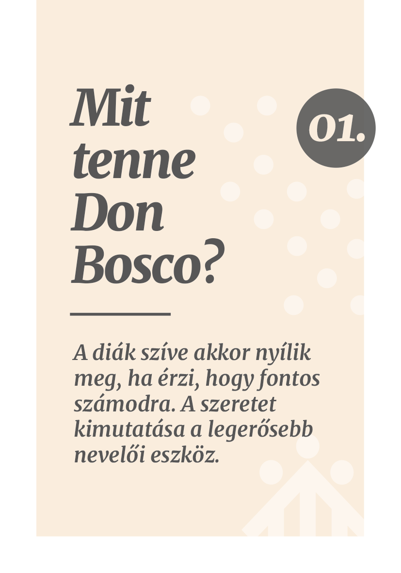 Kirner Gábor szalézi testvér ötlete nyomán született meg ez a kártyacsomag, amelyben 30 Don Boscótól származó, neveléssel kapcsolatos idézet olvasható. A kártyákon feltüntettük azt is, milyen helyzetben hangzottak el ezek a mondatok, majd a következő kártyán Gábor testvér inspiráló gondolatait olvashatjuk, így összesen 60 gondolattal gazdagodhatunk a hétköznapok rohanásában.